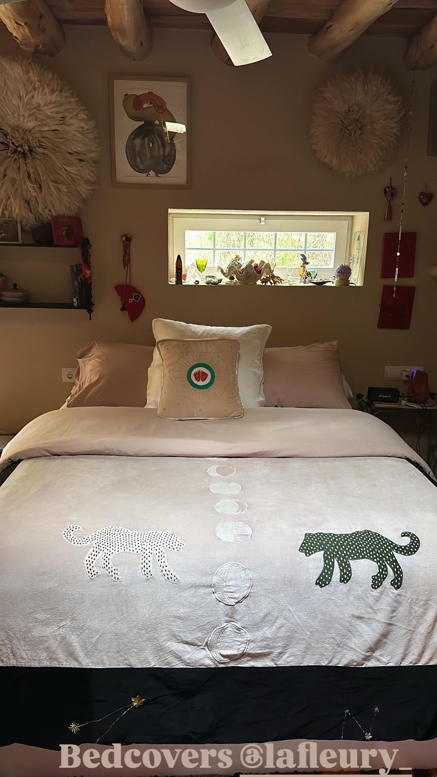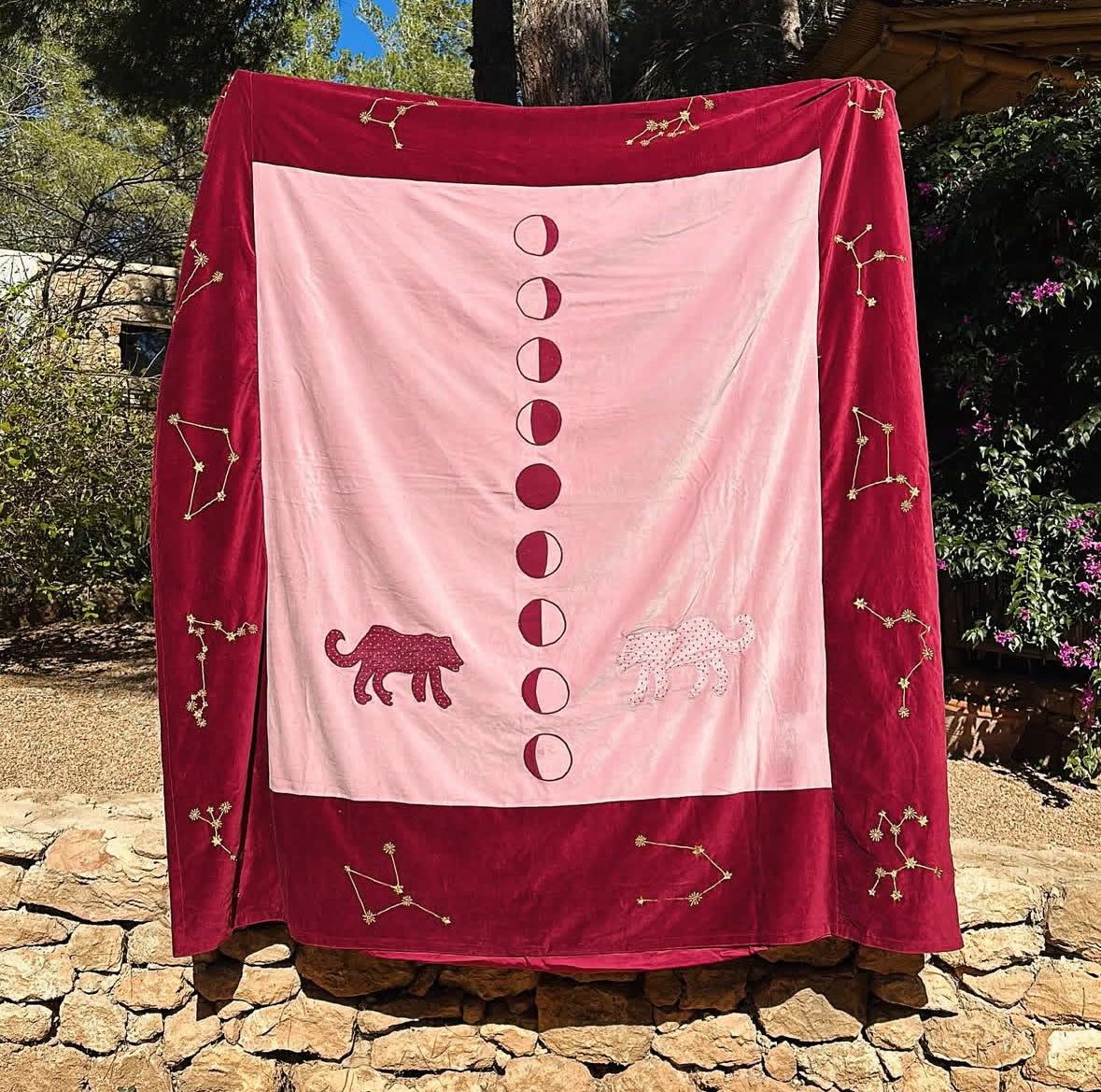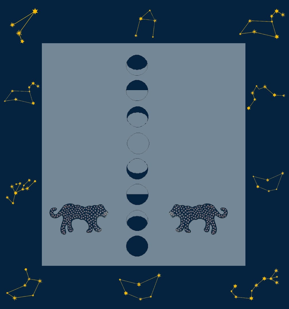 Embrace transformation with our luxurious cotton velvet blanket, adorned with a central moon phase embroidery surrounded by the entire star constellation. Two jaguars face each other, symbolising power, personal growth, and the courage to change your spots—a reminder that transformation is always possible.